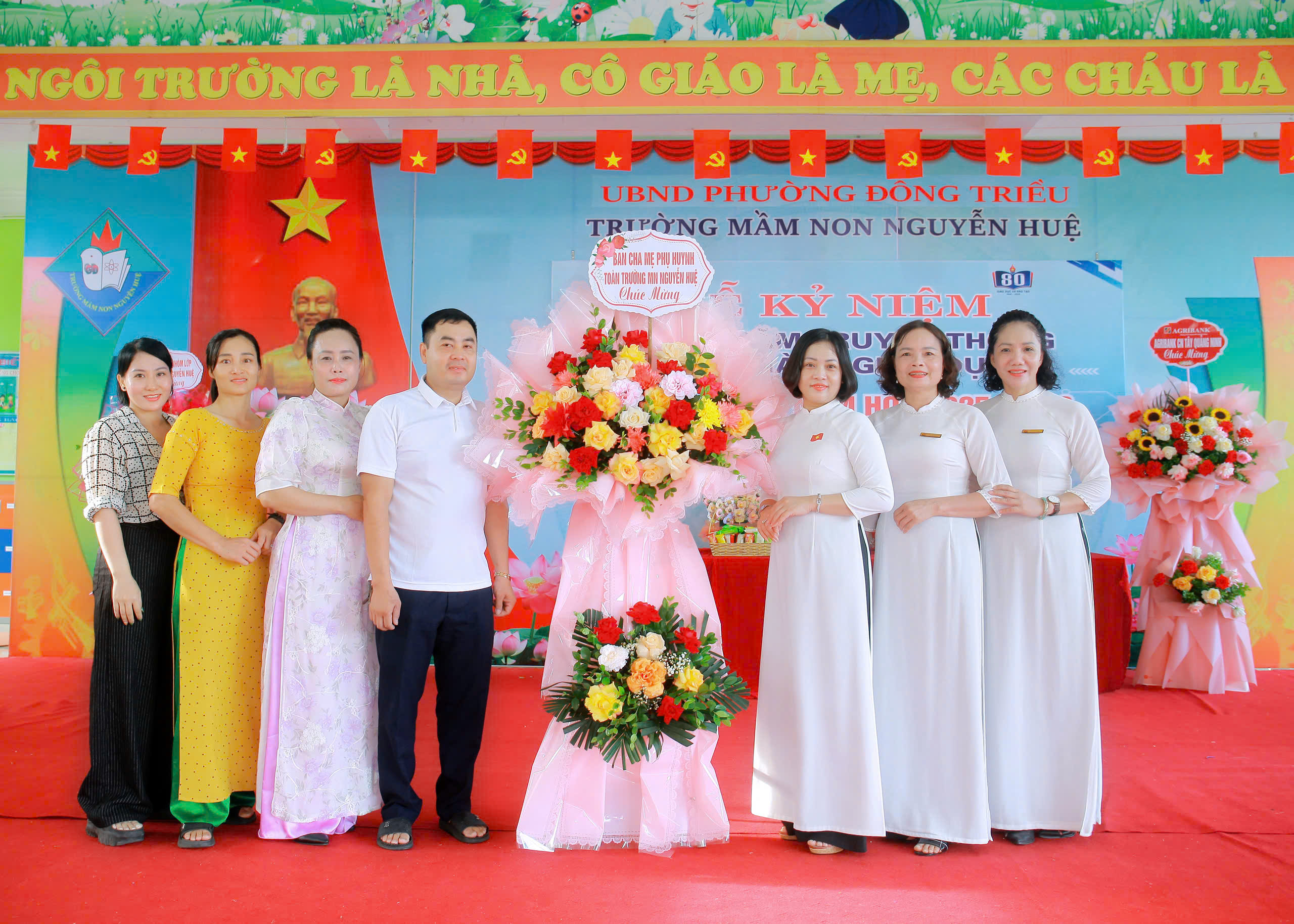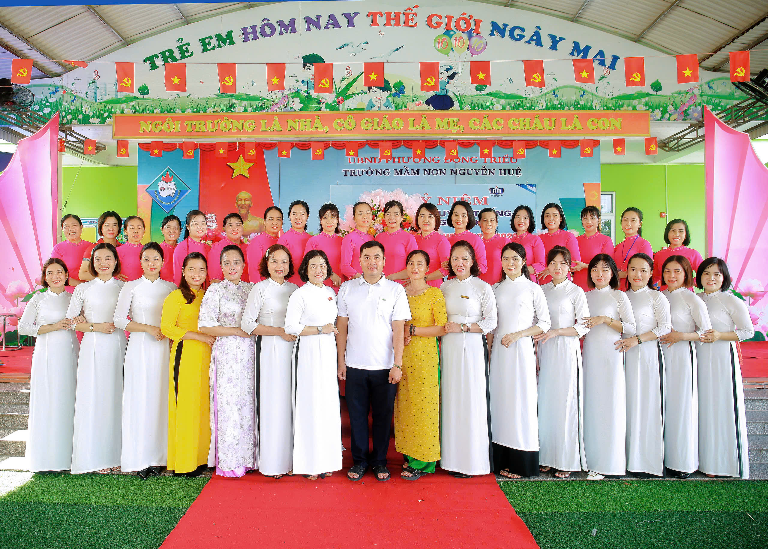 Sáng nay, ngày 05/09/2025, trong không khí tưng bừng, phấn khởi của cả nước hướng về Ngày hội toàn dân đưa trẻ đến trường, Trường Mầm non Nguyễn Huệ long trọng tổ chức "Lễ kỷ niệm 80 năm truyền thống ngành Giáo dục và Khai giảng năm học mới 2025-2026".Tới dự và động viên nhà trường có Ban đại diện cha mẹ học sinh toàn trường và các nhóm, lớp. Tập thể Sư phạm nhà trường cùng toàn thể phụ huynh và các bé học sinh.